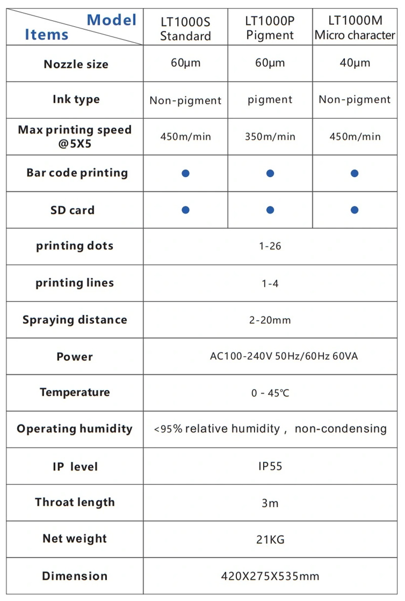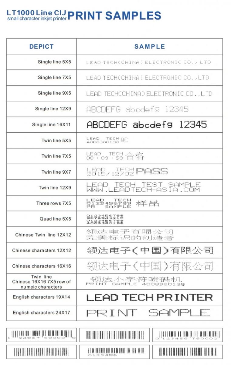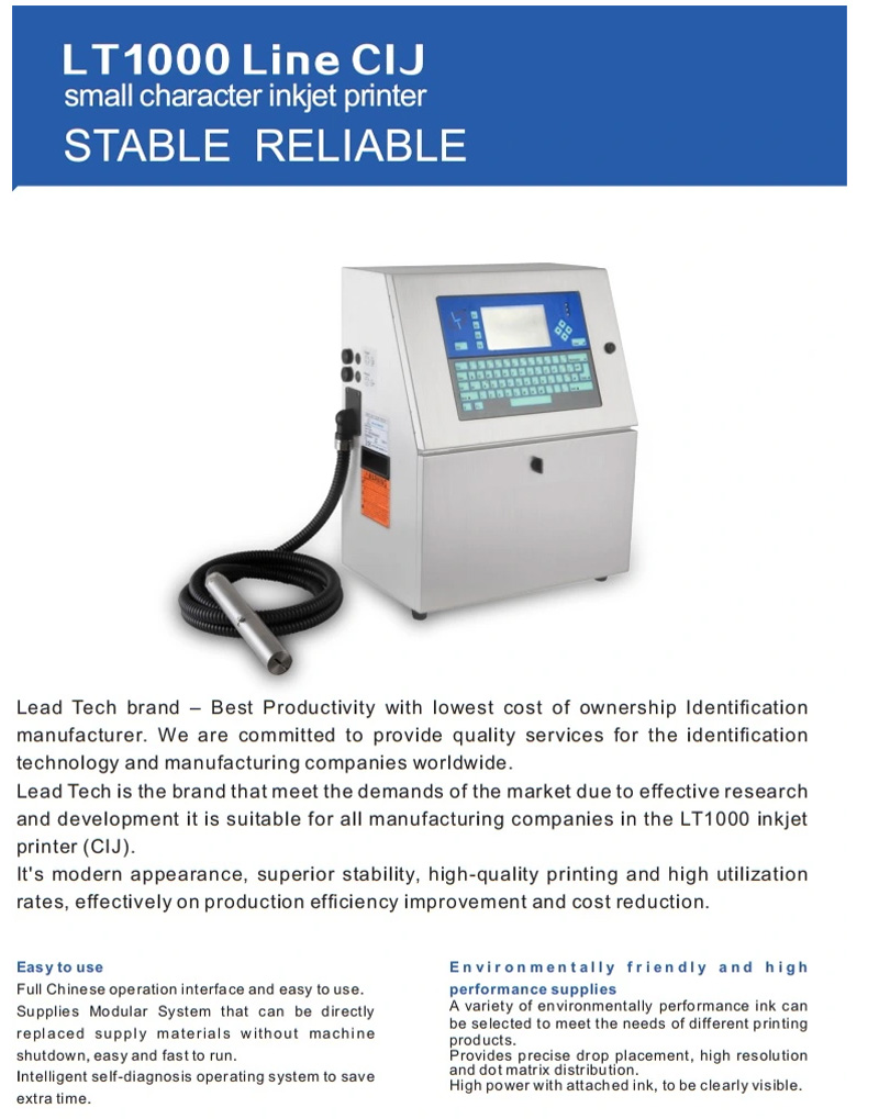 Lead Tech LT1000S+ Small Character high speed inkjet printer is specifically designed to meet basic coding and production applications across a wide range of industries. Designed to meet the demand for high-quality and reliable printing, this small character inkjet printer provides an extrememly user-friendly interface and is noted for improving production efficiency and offering cost savings.